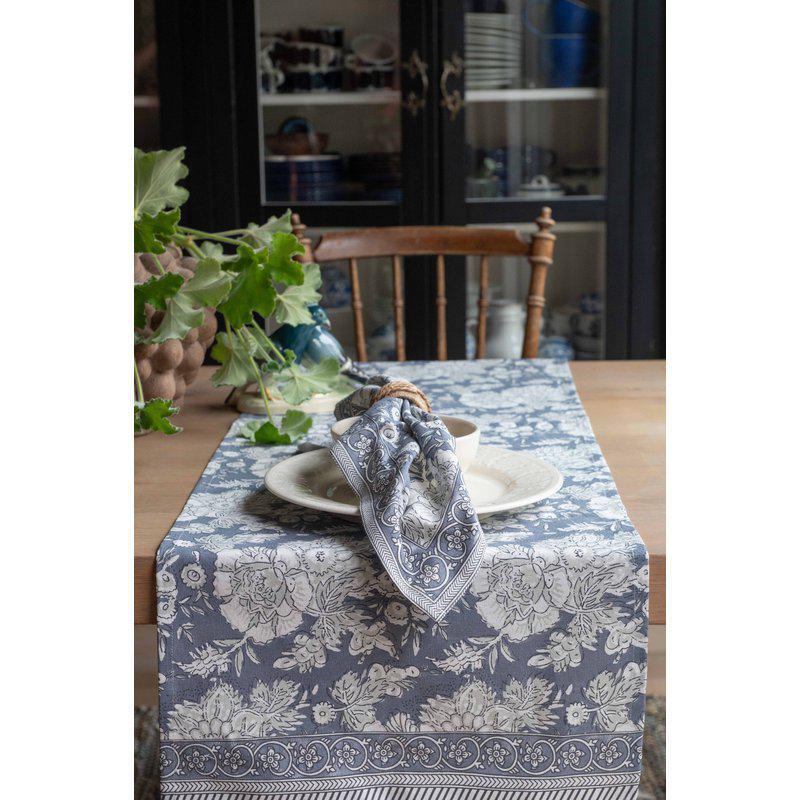 Stilfull bordløper laget av 100 % bomull med et praktfullt og detaljert mønster som gir borddekkingen et elegant og uttrykksfullt utseende. Løperen har en vakker bord på kortsidene som rammer inn designet og bidrar til et harmonisk og balansert uttrykk.
